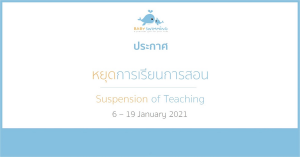 เนื่องจากสถานการณ์การแพร่ระบาดของ COVID-19 ในปัจจุบัน เพื่อความปลอดภัยสูงสุดของสมาชิกและพนักงานทุกท่าน BABY SWIMMING ของดการเรียนการสอนชั่วคราว ตั้งแต่วันที่ 6-19 มกราคม 2564