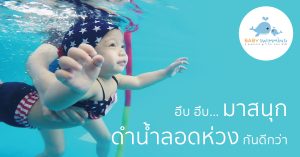 ปอดที่แข็งแรงคืออีกหนึ่งกุญแจสำคัญที่จะช่วยให้เบบี้มีทักษะการว่ายน้ำที่ดีค่ะ ดังนั้น การฝึกพลังปอดของลูกรักจึงเป็นสิ่งจำเป็นที่คุณพ่อคุณแม่ต้องส่งเสริมและสนับสนุนให้ลูกได้รับการฝึกอย่างสม่ำเสมอ โดยเฉพาะอย่างยิ่งการฝึก ‘ดำน้ำ’ ซึ่งวันนี้เราจะพามาทำความรู้จักกับกิจกรรมดำน้ำแสนสนุกอย่าง ‘การดำน้ำลอดห่วง’ จะทำได้อย่างไรมาดูกันค่ะ ฮึบ…กลั้น…ลอด…แล้วกอดกัน สิ่งสำคัญอันดับแรกที่คุณพ่อคุณแม่ต้องทราบเกี่ยวกับการฝึกดำน้ำของเจ้าตัวเล็กคือ อย่าฝึกลูกดำน้ำเองเด็ดขาด การฝึกดำน้ำในเด็กเล็กจำเป็นต้องมีผู้เชี่ยวชาญควบคุมดูแลอย่างใกล้ชิด ดังนั้น คุณพ่อคุณแม่ควรเลือกสถาบันสอนว่ายน้ำที่เหมาะสมสำหรับลูกรักให้ได้ก่อนที่จะให้เขาฝึกทักษะดำน้ำนะคะ โดยแนะนำให้เลือกสถาบันที่ได้รับการรับรองตามมาตรฐานสากลทั้งด้านการจัดการ...