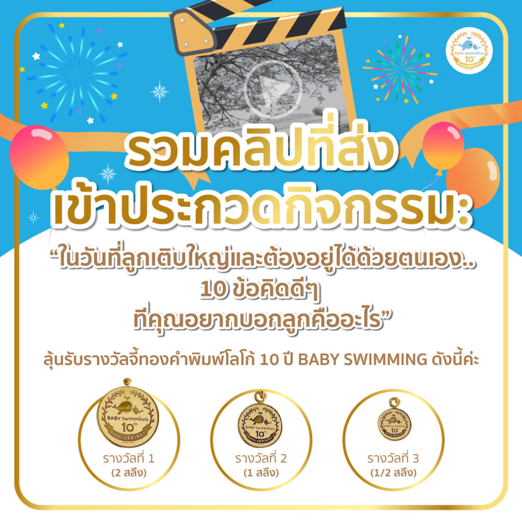 ใกล้ถึงวันประกาศผลกิจกรรม “การแข่งขันรอบสุดท้ายเพื่อลุ้นรับรางวัลจี้ทองคำแท้พิมพ์โลโก้ 10 ปี BABY SWIMMING” แล้วนะคะ ก่อนจะทราบผลว่าท่านใดเป็น Champ of the Champ ที่ได้ครอบครองรางวัลใหญ่สุดพิเศษทั้ง 3 รางวัลนี้ แอดมินขอพาทุกท่านมาชมคลิปวิดีโอที่ผู้ชนะเลิศรอบแรกซึ่งเป็นตัวแทนของแต่ละสาขาส่งเข้ามาร่วมกิจกรรมกันก่อนนะคะ ตามโจทย์ที่ว่า :