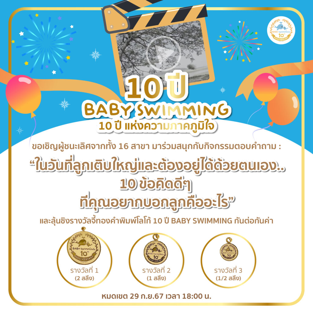 มาแล้วค่า… การแข่งขันรอบสุดท้ายเพื่อลุ้นรับรางวัลจี้ทองคำแท้พิมพ์โลโก้ 10 ปี BABY SWIMMING สุดพิเศษของเรา