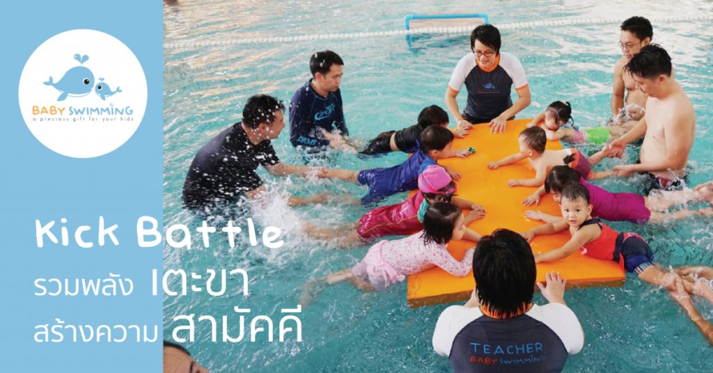 - เมื่อเจ้าตัวเล็กได้ทำความคุ้นเคยกับน้ำ รวมทั้งได้รู้จักวิธีที่จะขยับขาทั้งสองข้างขึ้นลงสลับกันเพื่อการเคลื่อนที่ไปด้านหน้าแล้วคราวนี้ให้เด็กๆ รวมตัวกับเพื่อนๆ วัยเดียวกันแล้วแบ่งออกเป็น 2 ทีมค่ะ